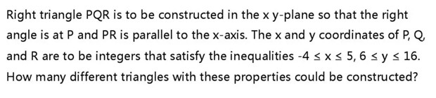首先来看题目,角QPR是平面直角坐标系xy中的直角,且PR平行于x轴,P Q R坐标均为整数,且在-4 ≤ x ≤ 5, 6 ≤ y ≤ 16的矩形内。