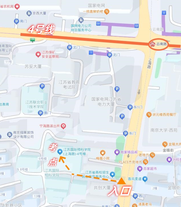 考试日考生进入考点的唯一通道为南京市鼓楼区上海路205号门(原江苏国际预科学院),进入后步行到达4号楼(具体路线见下图)。送考车辆禁止进入大院。所有送考人员严禁在考场入口外聚集或等候,应服从现场安保人员指挥。
