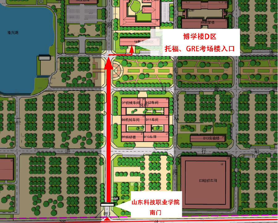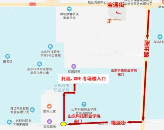 考生进校通道:山东科技职业学院南门(潍坊市西环路与福源西街岔路口西1公里左右,非学院西南门),其他校门在考试期间将不允许考生进入。(位置图详见附件)