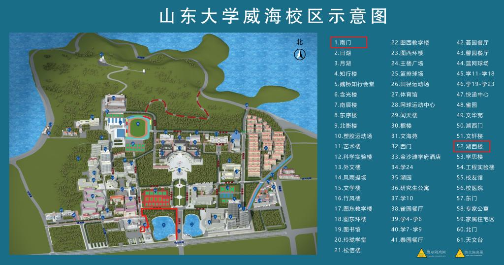 您的考场位于山东省威海市文化西路180号山东大学(威海)湖西楼,请从威海校区南门进出校园,进入校门后按照示意图指示到达湖西楼,从湖西楼东门上楼至四楼A404教室,其他校门在考试期间将不对考生开放。