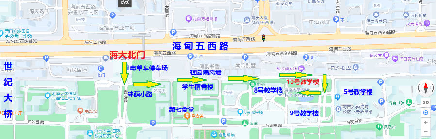 托福、GRE考试考点设在海南大学10号教学楼2楼,海南大学海甸校区(海南省海口市海甸岛)北门为考生前往考点的唯一通道。北门到考点的距离约为600米,您可从北门步行到达考点。未经事先登记的社会车辆不得进入校园,考点恕不提供停车服务。校园里的托福、GRE标志和以下地图可指引您到达考点。您也可以尝试校内导航,直接搜索“海南大学海甸校区10号教学楼”即可。